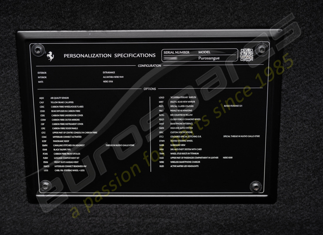 - InteriorINTERNAL COLOURS ALCANTARA NERA 9441, BLACK CARPETS, UPPER PART IN COLORED LEATHER NERO 8500 (BLACK) ,HORSE STITCHED ON HEADREST(FILO NUOVO GIALLO 0700 E)COLOURED SPECIAL STITCHING(FILO SPEC NUOVO GIALLO 0700E),FRONT SEATS MASSAGE+VENT,CARBON FIBRE HEATED STEERING WHEEL + LEDS,CARBON FIBRE INSTRUMENT CLUSTER,REV COUNTER IN GIALLO,CARBON FIBRE UPPER TUNNEL TRIM,CARBON FIBRE DOOR PANELS,MYFERRARI CONNECT ACTIVATED,EMERGENCY CALL SYSTEM,HW READINESS MYFERRARI CONNECTDIGITAL REARVIEW MIRROR,PERSONALIZATION PACK,SMARTPHONE CONNECTION,SISTEMA AUDIO HIGH-END,SURROUND VIEW,ANTITHEFT SYSTEM SVR WITH CARD,WIRELESS CHARGER SMARTPHONE,